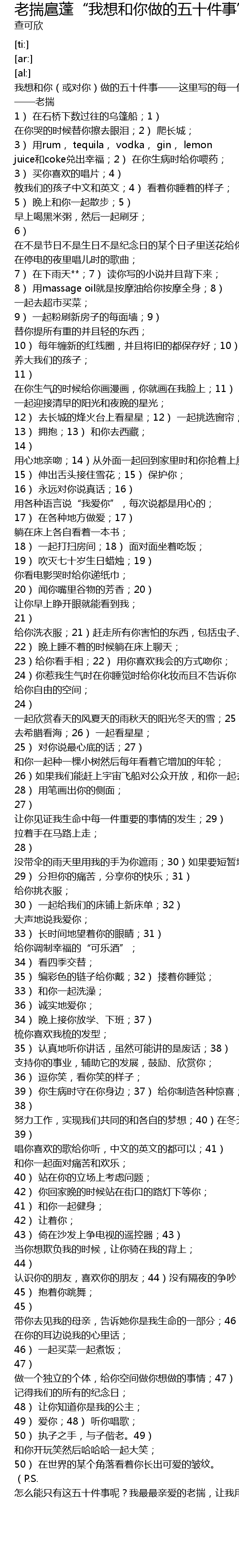 | [00:00.00] | 我想和你(或对你)做的五十件事——这里写的每一件事都是发自真心的,写的时候我看到在我的未来里你的样子。 ——老揣 |