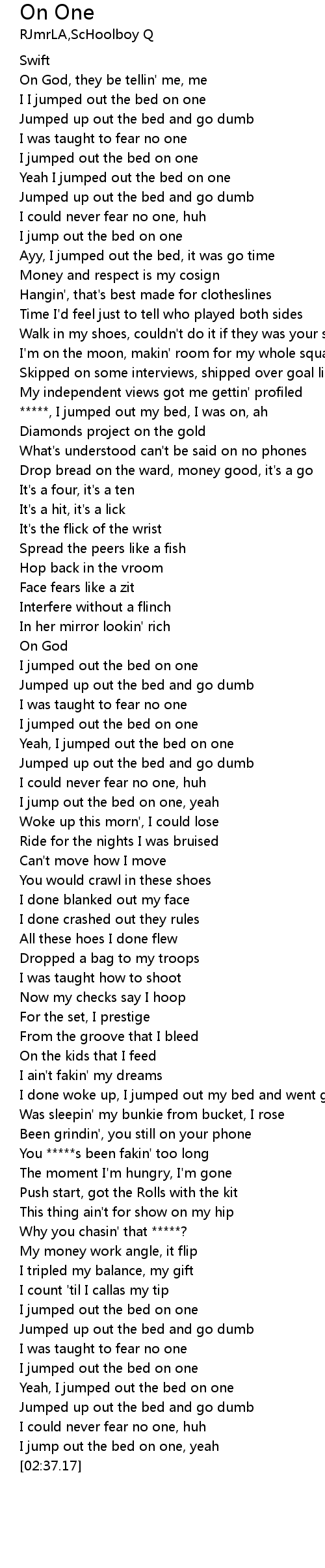 | [01:35.41] | I jump out the bed on one, yeah |