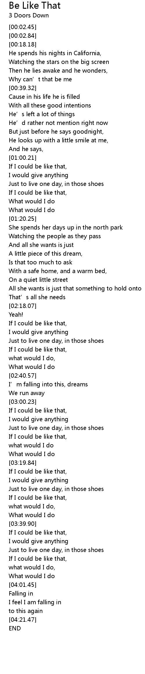 | [03:00.67] | If I could be like that, |