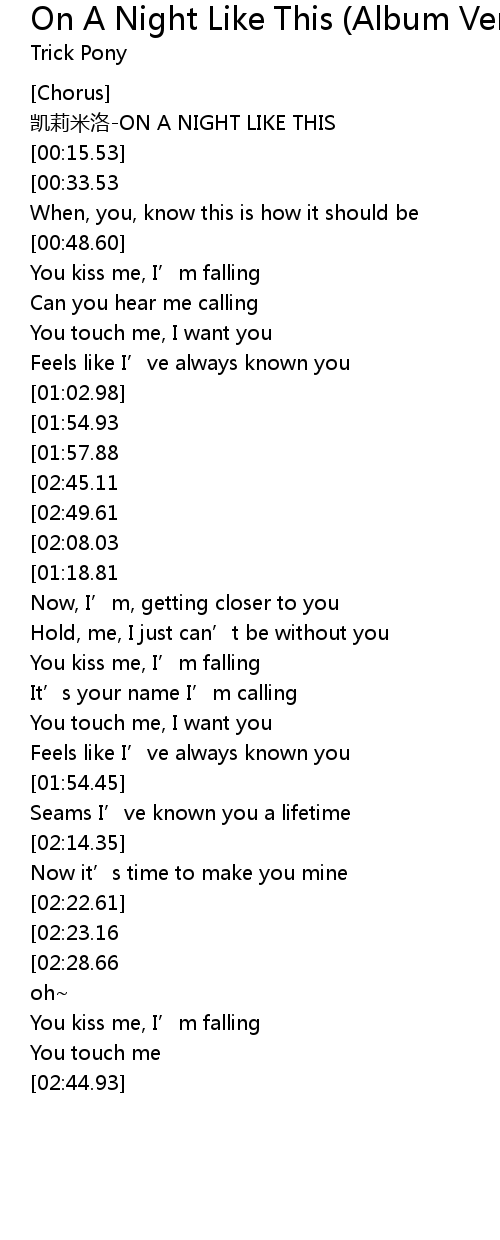 | [00:07.41] | kǎi lì mǐ luò ON A NIGHT LIKE THIS |