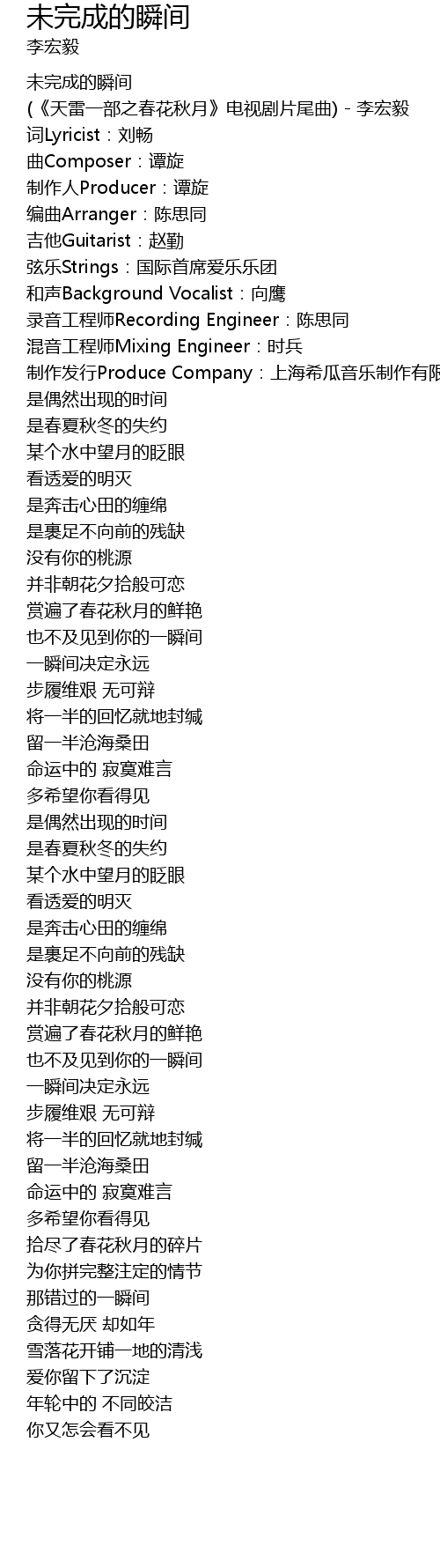 | [00:00.46] | 未完成的瞬间 (《天雷一部之春花秋月》电视剧片尾曲) - 李宏毅 |