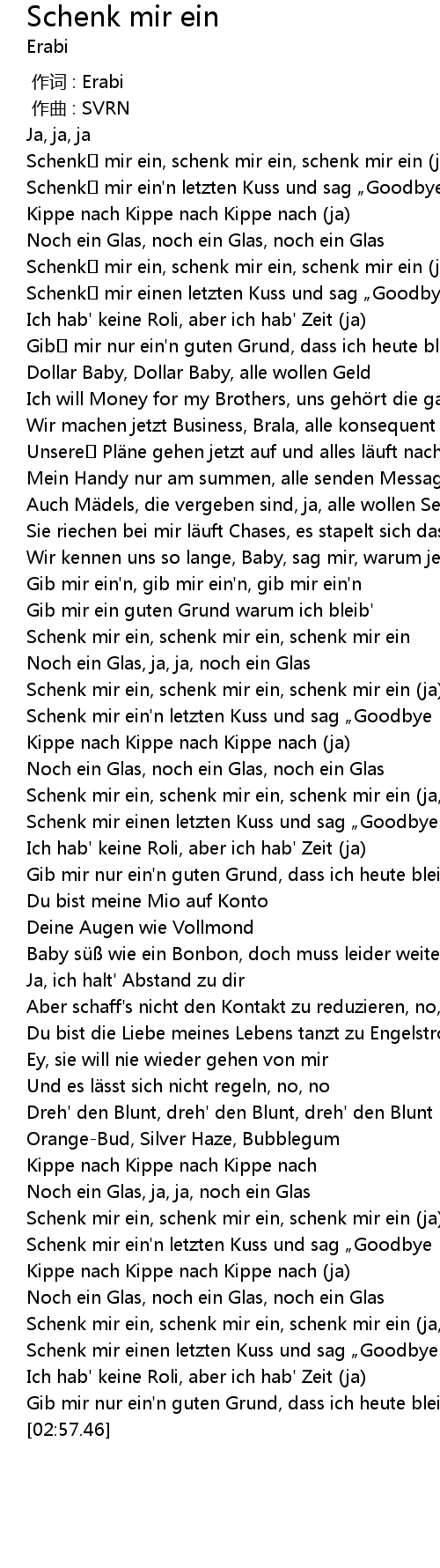 | [00:38.73] | Schenk mir ein, schenk mir ein, schenk mir ein (ja, ja, ja) |