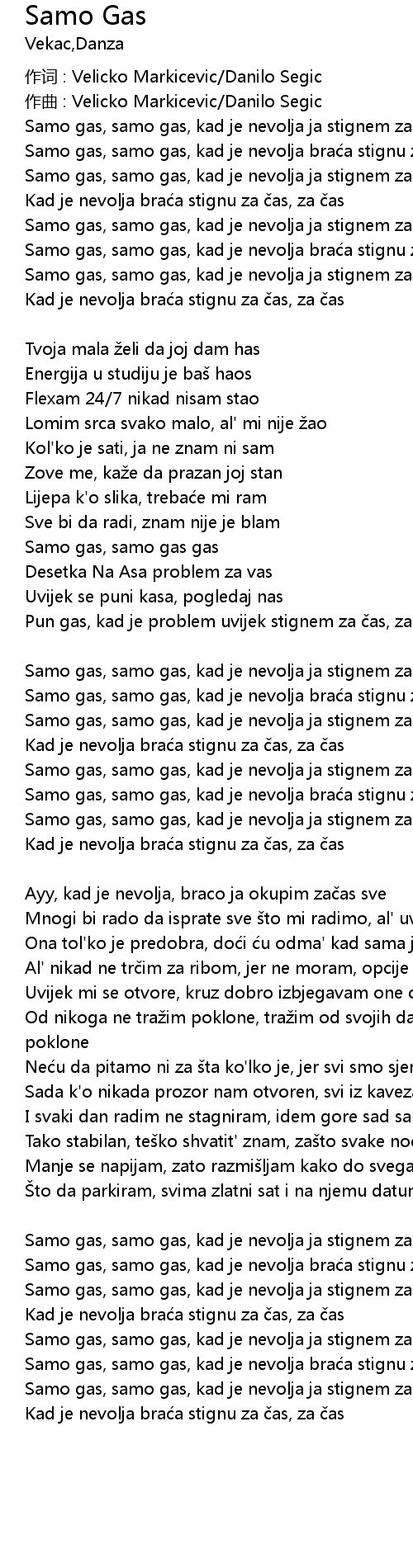 | Samo gas, samo gas, kad je nevolja ja stignem za as | |