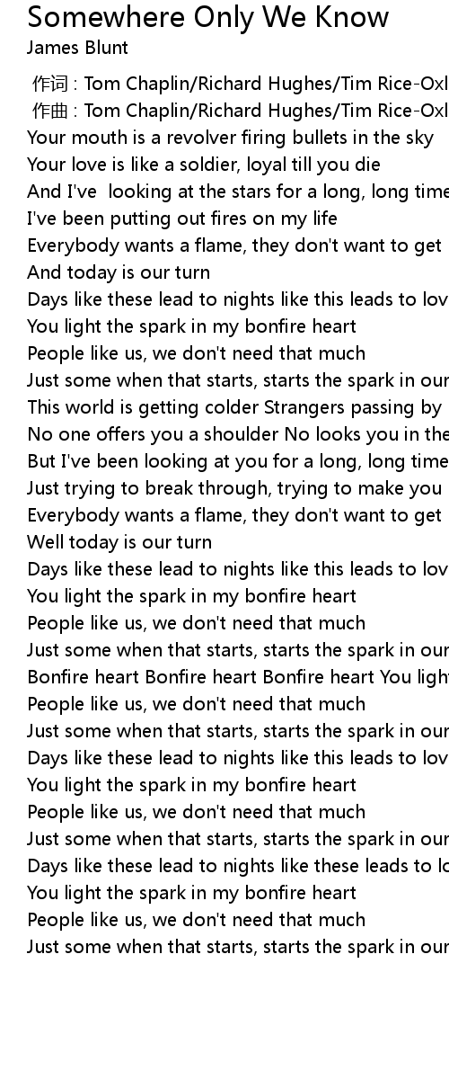 | [03:45.48] | Just some when that starts, starts the spark in our bonfire hearts |