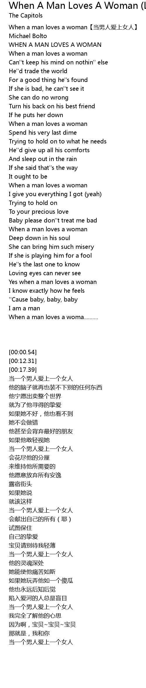 | [00:17.39] | WHEN A MAN LOVES A WOMAN |
