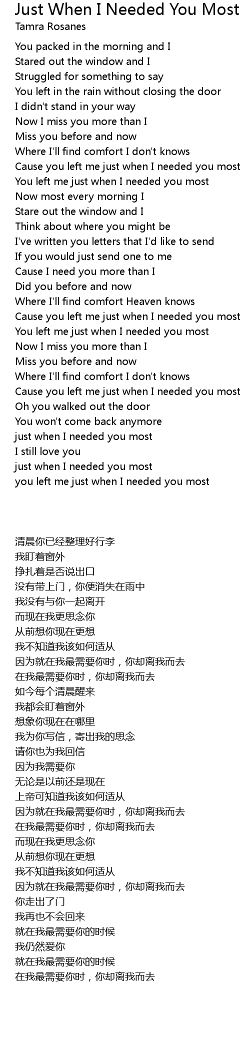 Cause you left me just when I needed you most |