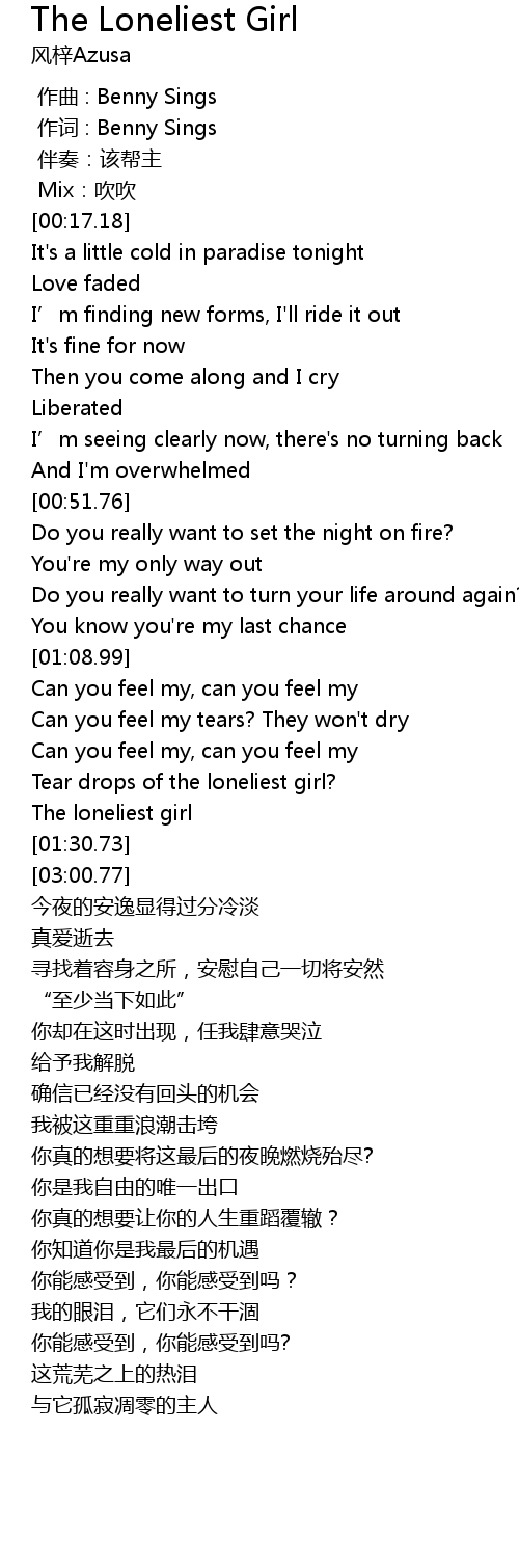 | [01:21.98] | Tear drops of the loneliest girl? |