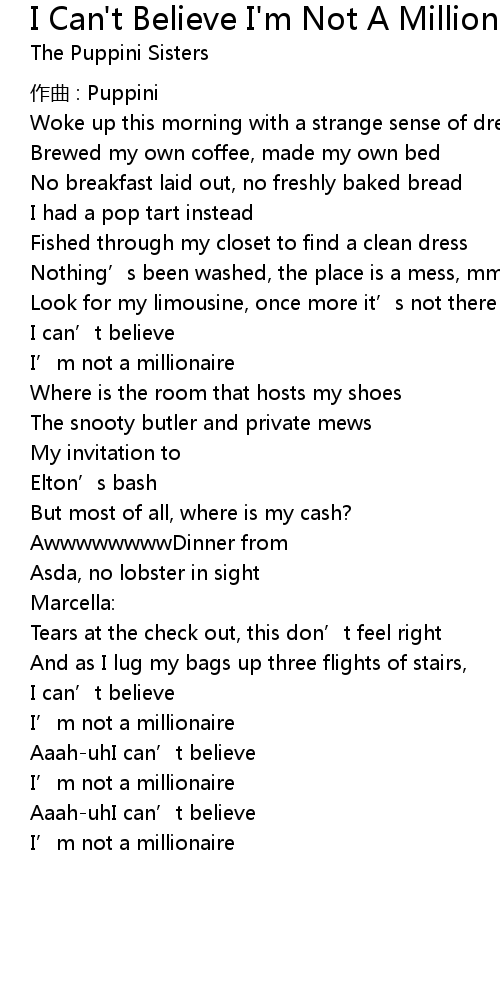 | Song | I Can't Believe I'm Not A Millionaire |