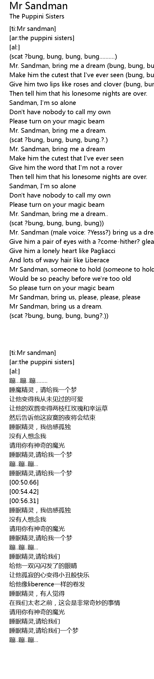 [00:07.51] Mr. Sandman, bring me a dream (bung, bung, bung, bung)