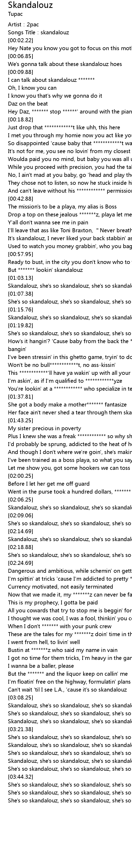 | [02:02.56] | Went in the purse took a hundred dollars, ******* I'm so skandalouz |