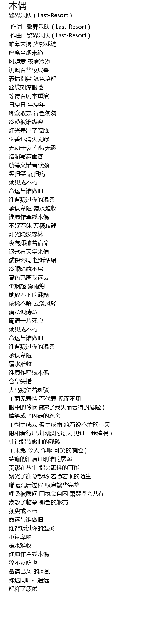 | [00:01.000] | 作曲 : 繁界乐队(Last-Resort) |