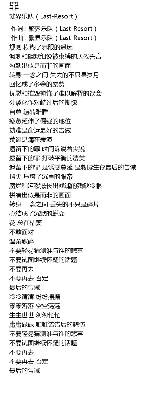 | [00:01.000] | 作曲 : 繁界乐队(Last-Resort) |