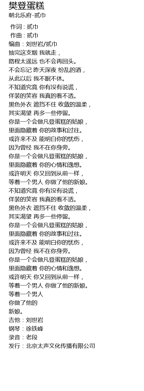 | [03:45.000] | nǐ shì yí gè huì zuò fán dēng dàn gāo de gū niáng, |