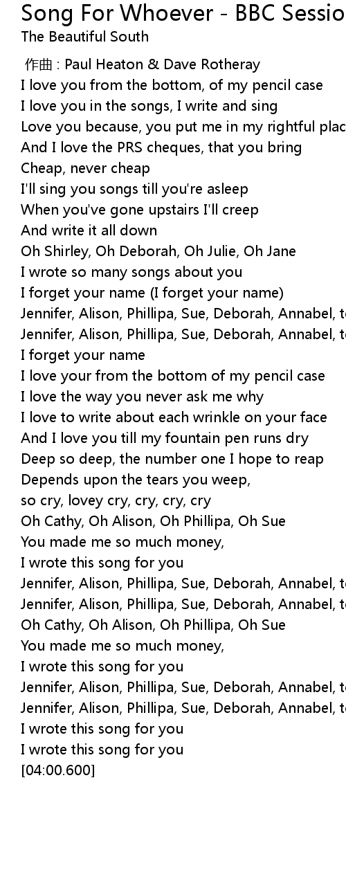 | [00:00.00] | 作曲 : Paul Heaton & Dave Rotheray |