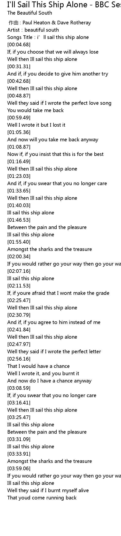 | [00:02.05] | Songs Title:i’ll sail this ship alone |