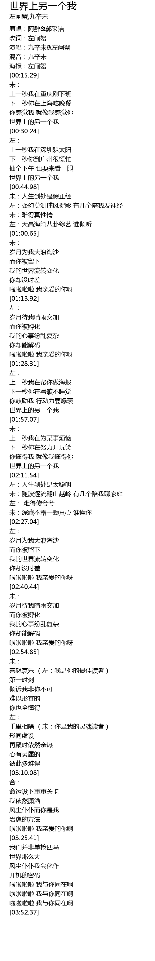 | [00:07.21] | 演唱:九辛未&左闸蟹 |