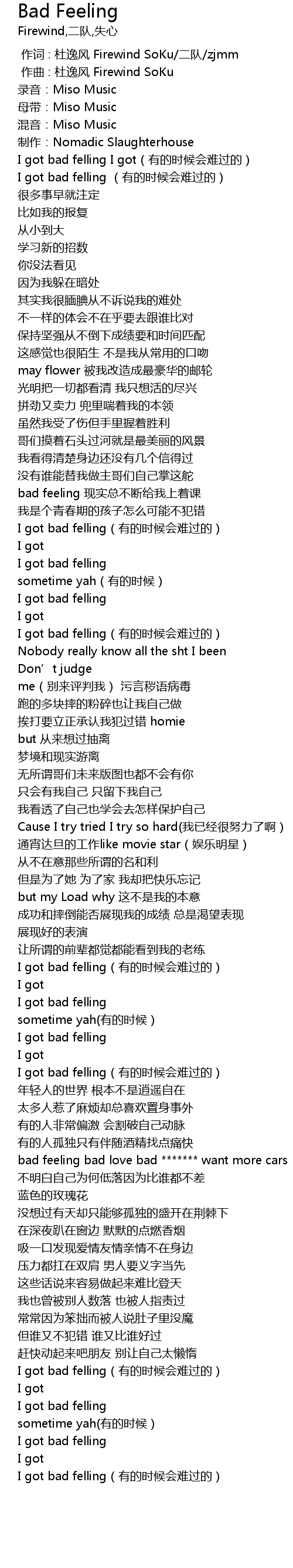 | [00:59.088] | bad feeling xiàn shí zǒng bù duàn gěi wǒ shàng zhe kè |
