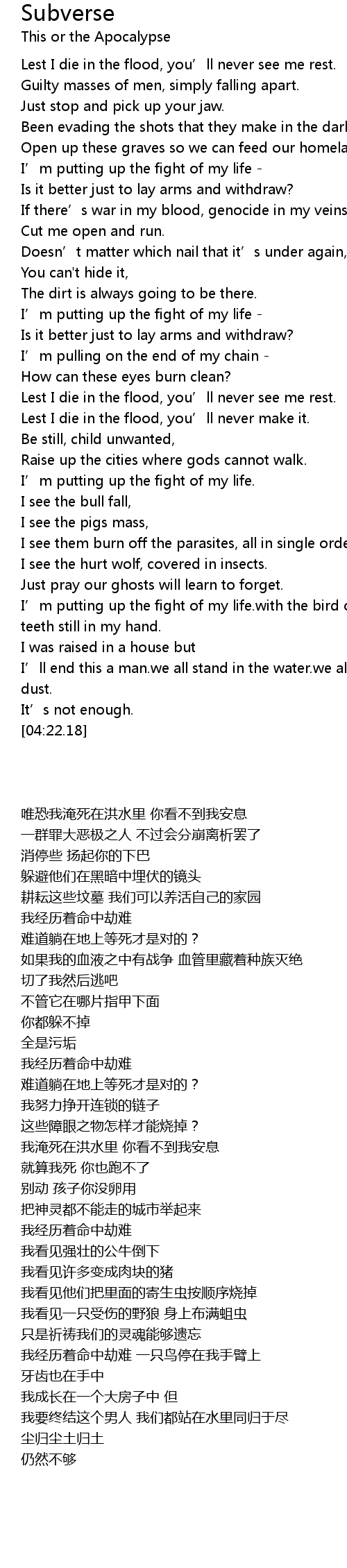 | [00:48.80] | Lest I die in the flood, you' ll never see me rest. |