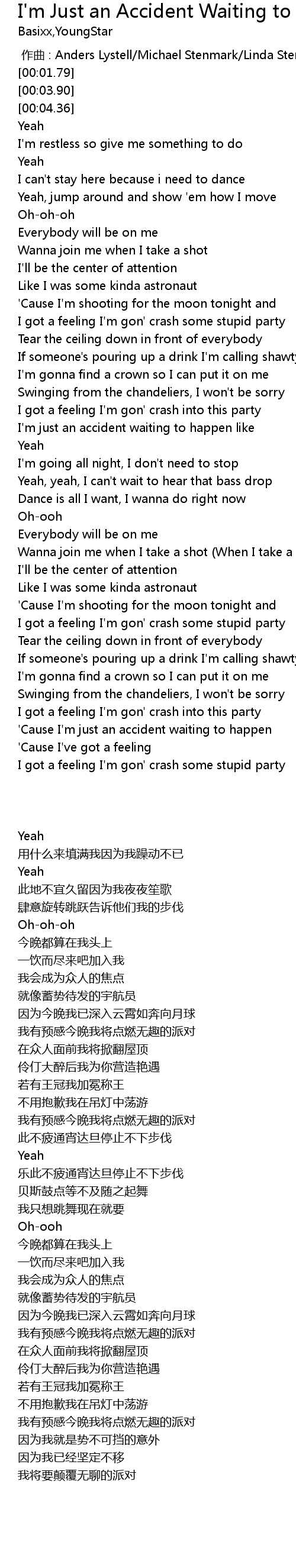 | [02:36.73] | ' Cause I' m just an accident waiting to happen |