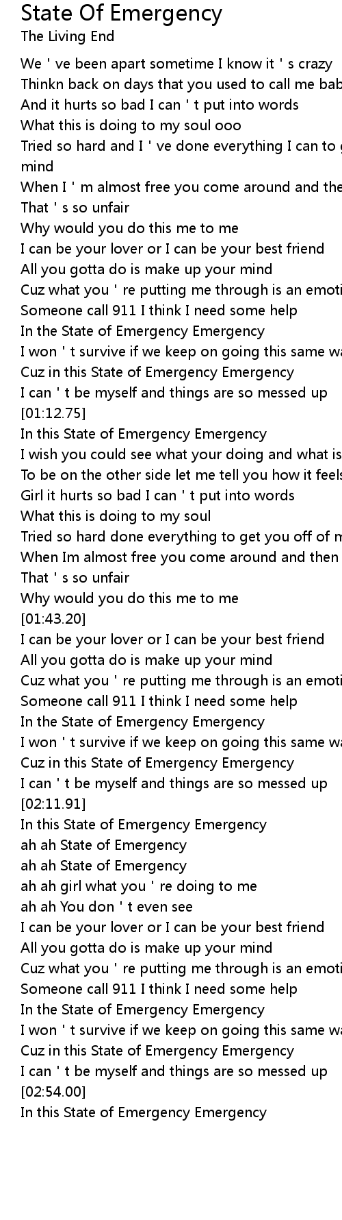 | [01:14.00] | In this State of Emergency Emergency |
