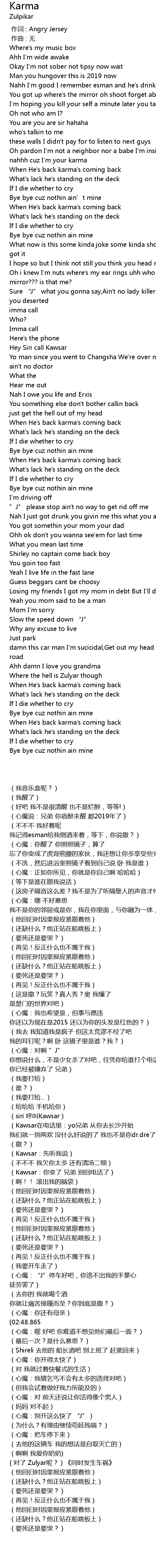 | [00:53.894] | Oh pardon I'm not a neighbor nor a babe I'm inside you you hear me nahhh cuz I'm your karma |