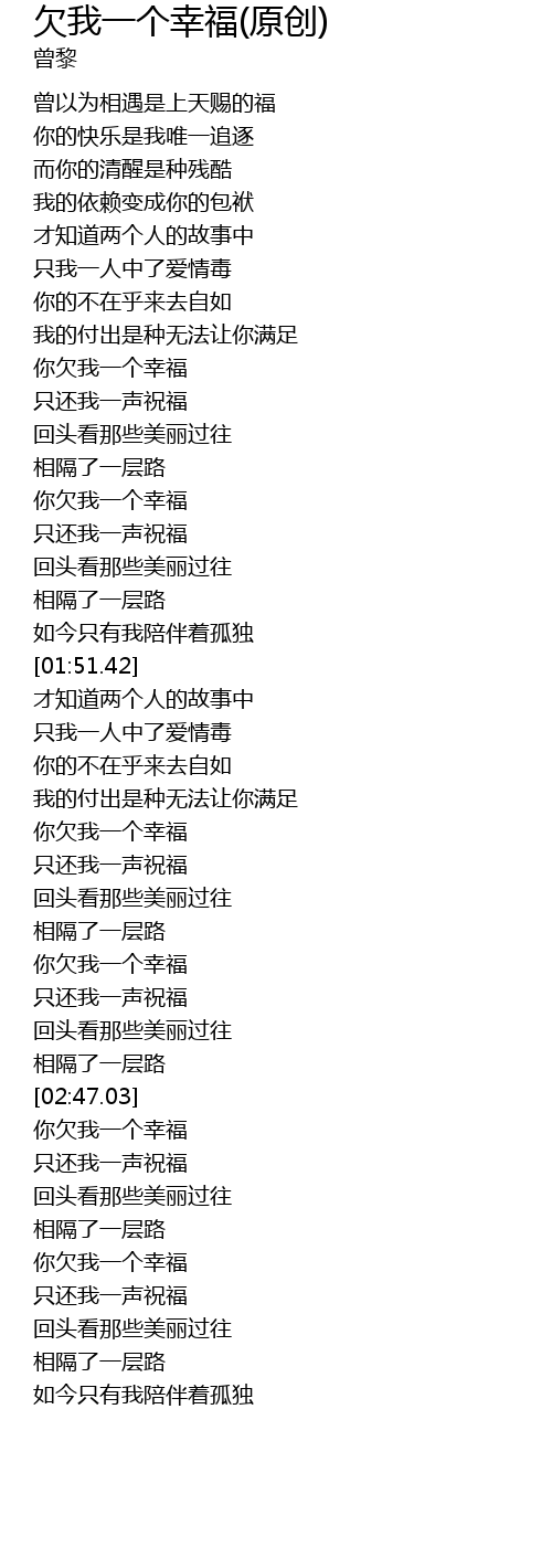 | [02:18.65] | 你欠我一个幸福 |