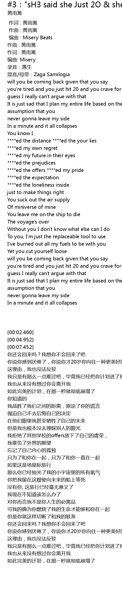| Song | #3:"sH3 said she Just 2O & she couldn't do this ANYmore" |