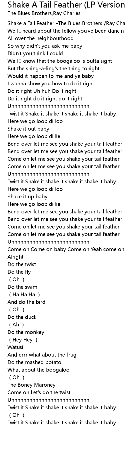 | [00:00.00] | Shake a Tail Feather The Blues Brothers Ray Charles Singers |