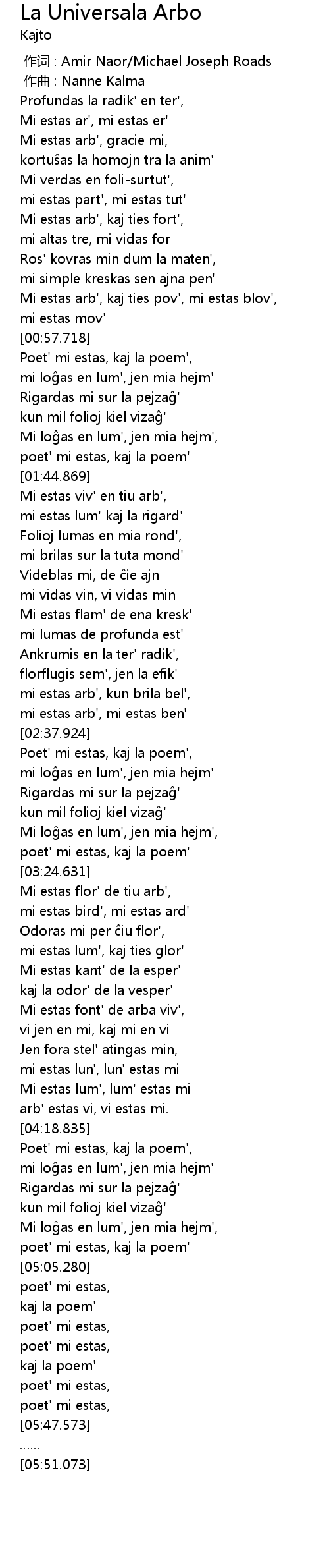 | [00:45.493] | Mi estas arb', kaj ties pov', mi estas blov', |