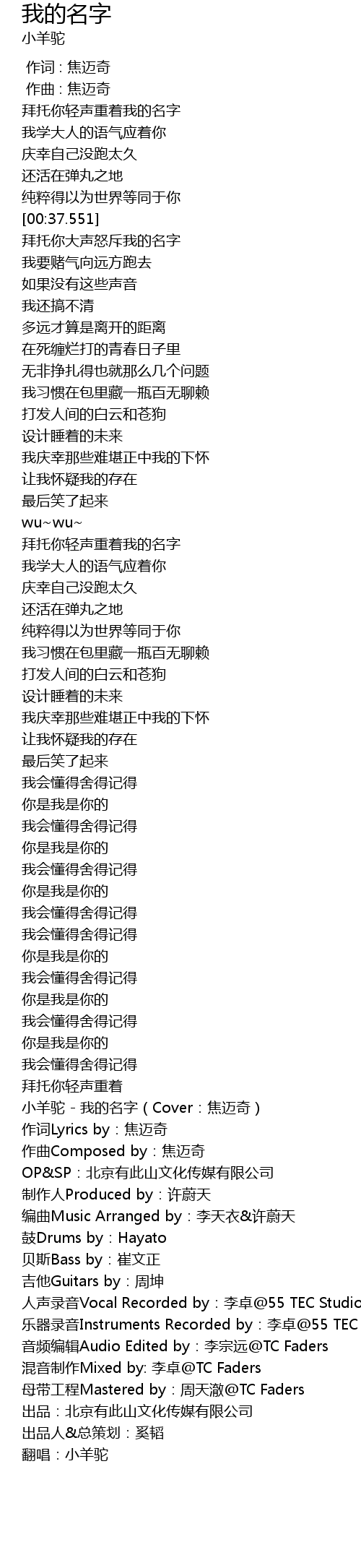 | [04:00.470] | 小羊驼 - 我的名字(Cover:焦迈奇) |