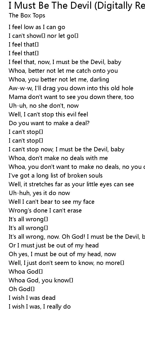 | It' s all wrong, now. Oh God! I must be the Devil, baby | |