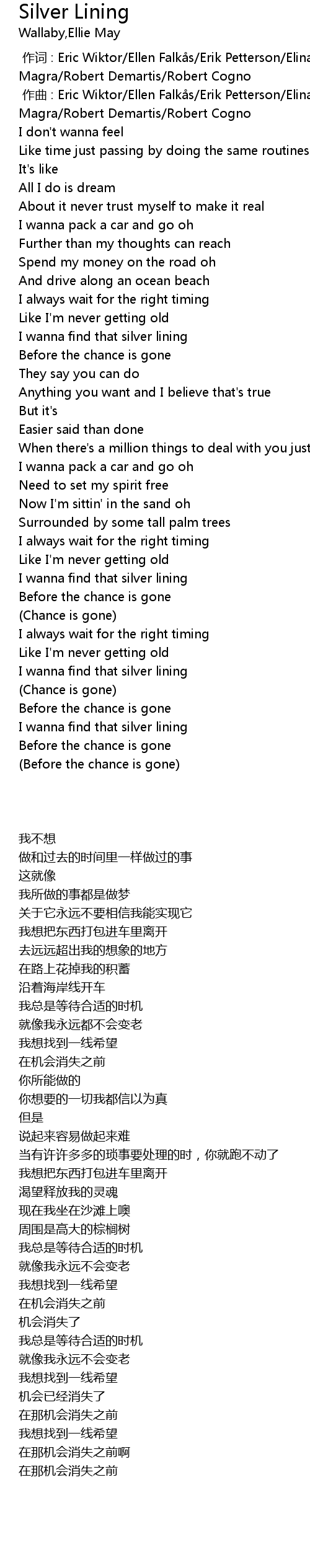 | [00:00.00] | 作词 : Eric Wiktor/Ellen Falkås/Erik Petterson/Elina Mayskär/Luca Magra/Robert Demartis/Robert Cogno |