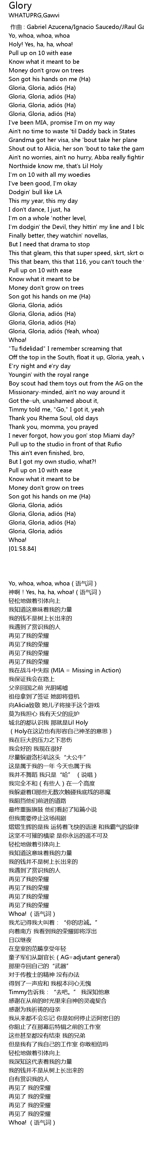 | [01:17.35] | Off the top in the South, float it up, Gloria, yeah, whoa |