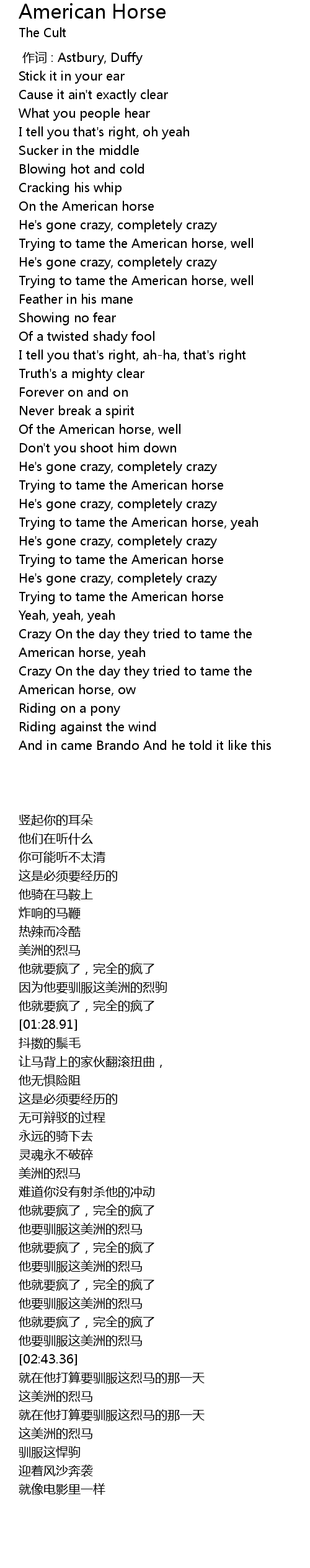 | [02:15.63] | Trying to tame the American horse, yeah |