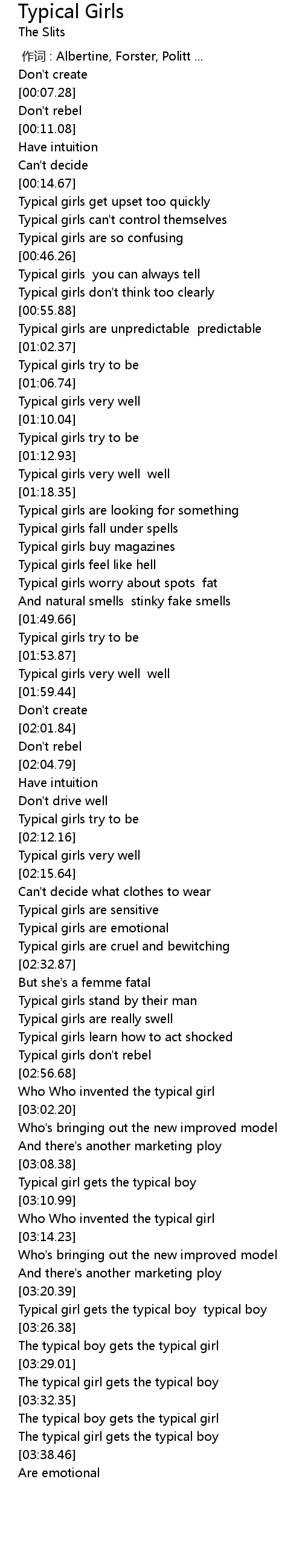 | [02:59.54] | Who Who invented the typical girl |