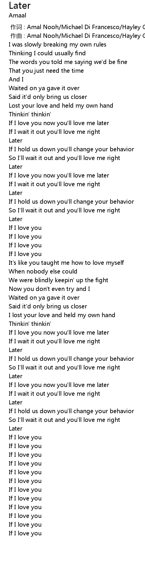| [00:01.00] | 作曲 : Amal Nooh/Michael Di Francesco/Hayley Gene Penner |