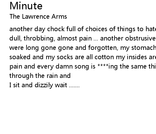 | another day chock full of choices of things to hate another forehead, cobwebby, dull, throbbing, almost pain ... another obstrusive reminder of things i hoped were long gone gone and forgotten, my stomach feels rotten my shoes are all soaked and my socks are all cotton my insides are black from the smoking and pain and every damn song is ****ing the same this same goddamn train glides soft through the rain and | |