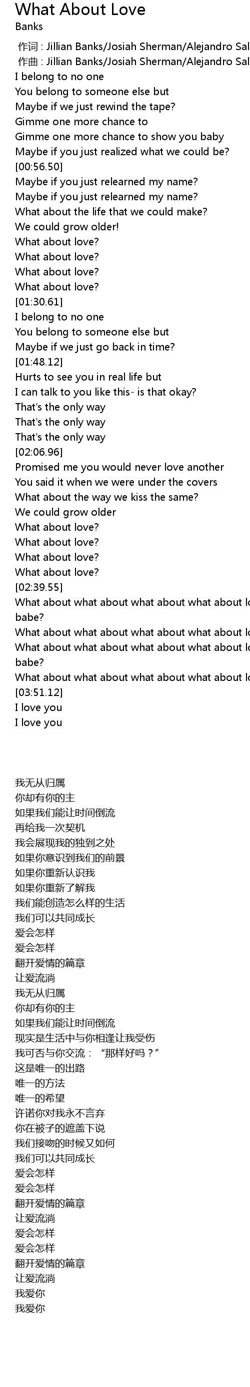 | [03:38.87] | What about what about what about what about love, what about love? |