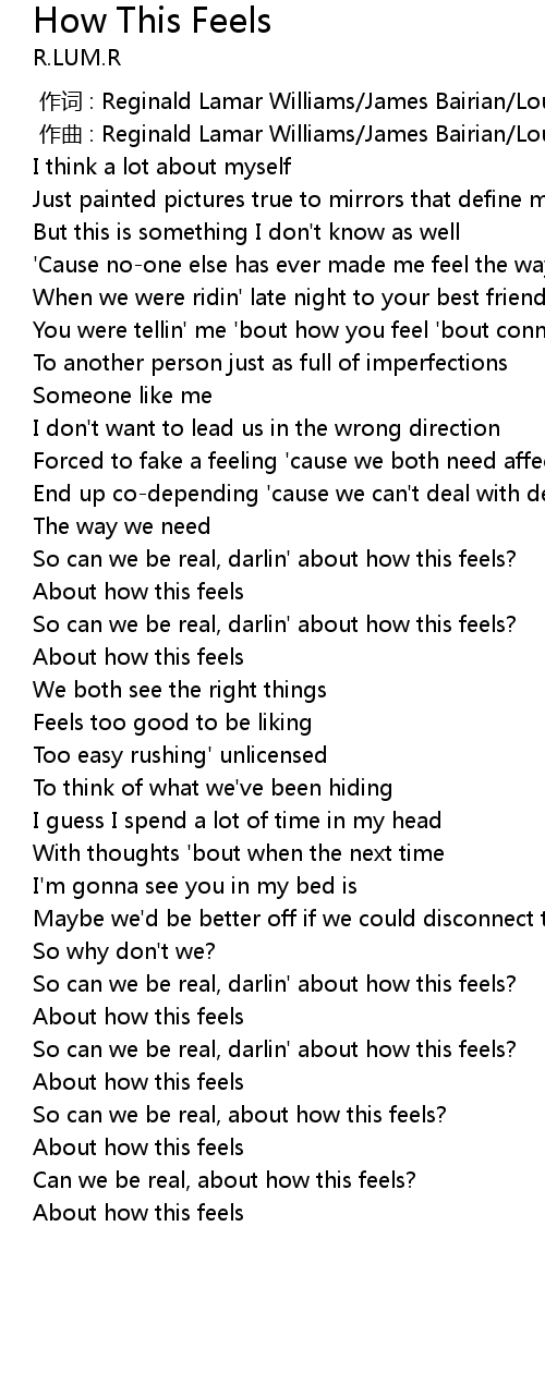 | [00:59.04] | So can we be real, darlin' about how this feels? |
