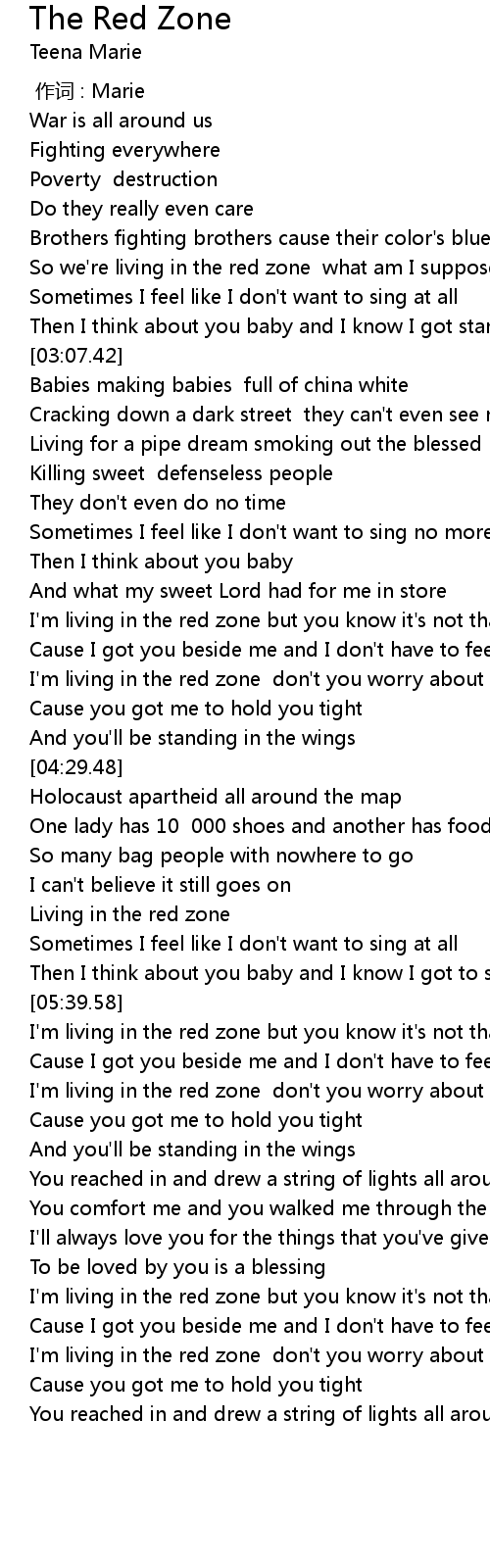 | [04:15.41] | I' m living in the red zone don' t you worry about a thing |