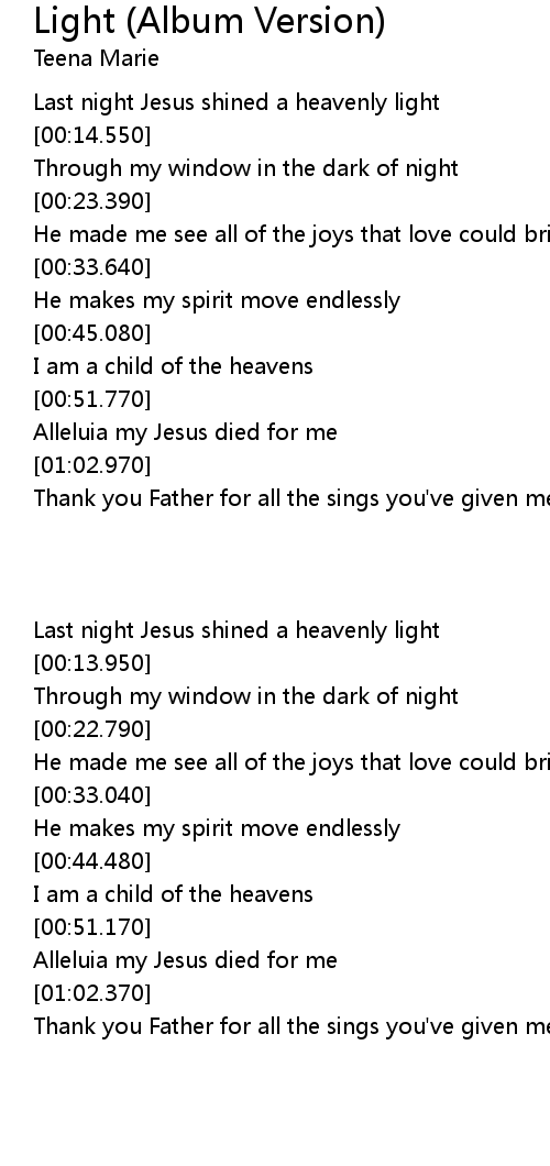 | [00:08.580] | Last night Jesus shined a heavenly light |