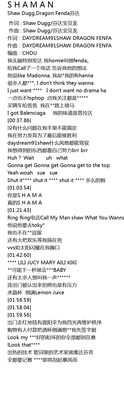 | [00:01.22] | zuò qǔ: DAYDREAM91SHAW DRAGON FENFA |