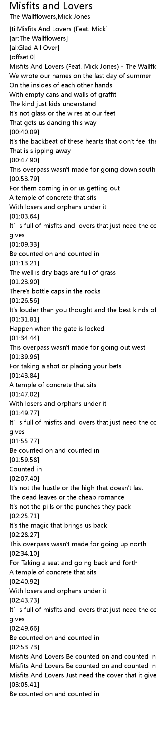 | [00:00.61] | Misfits And Lovers (Feat. Mick Jones) - The Wallflowers |