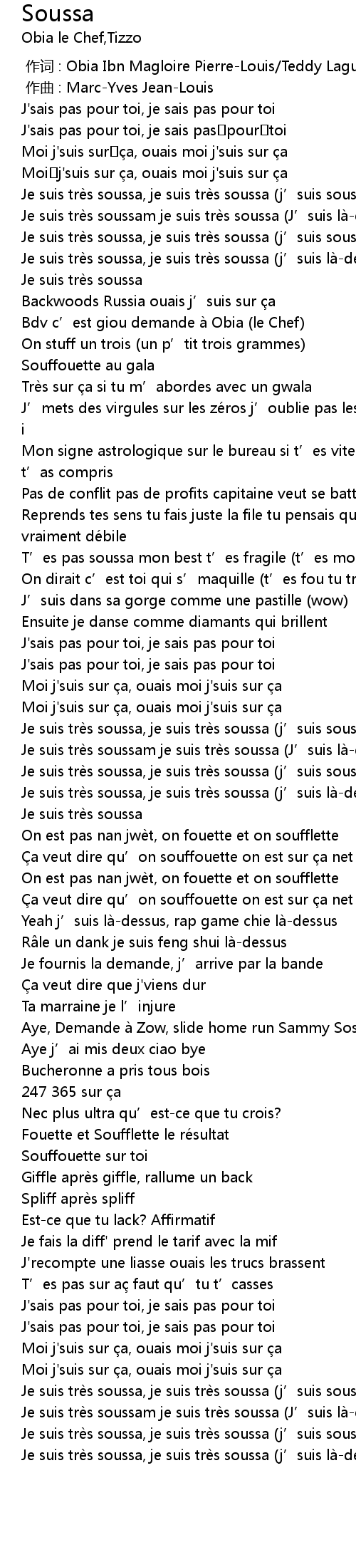 | [00:35.17] | Je suis très soussa, je suis très soussa (j’suis souss) |