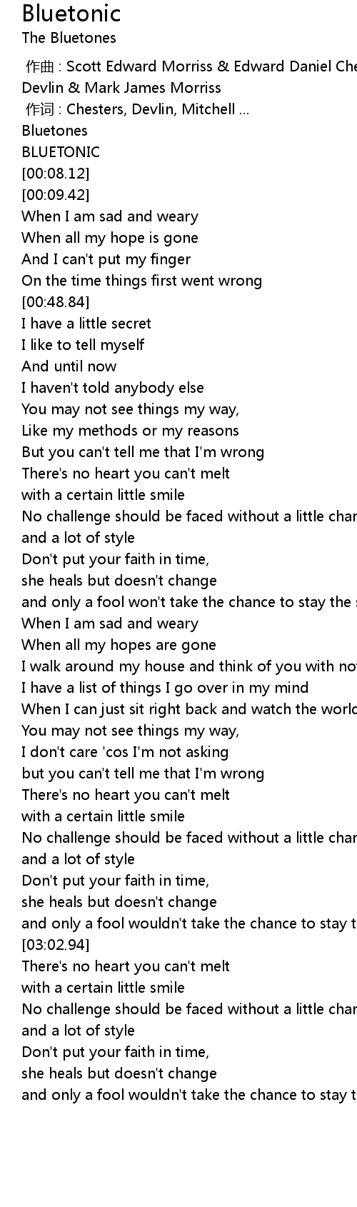 | [00:00.00] | zuo qu : Scott Edward Morriss Edward Daniel Chesters Adam Patrick Devlin Mark James Morriss |