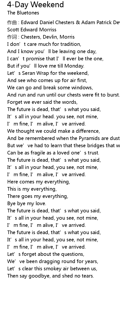 | 作曲 : Edward Daniel Chesters & Adam Patrick Devlin & Mark James Morriss & Scott Edward Morriss | |