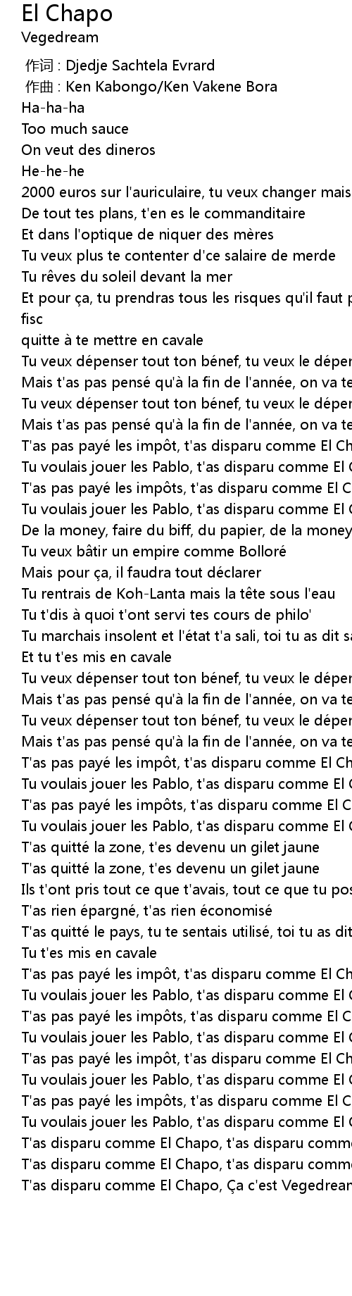 | [00:46.59] | T' as pas paye les imp t, t' as disparu comme El Chapo |