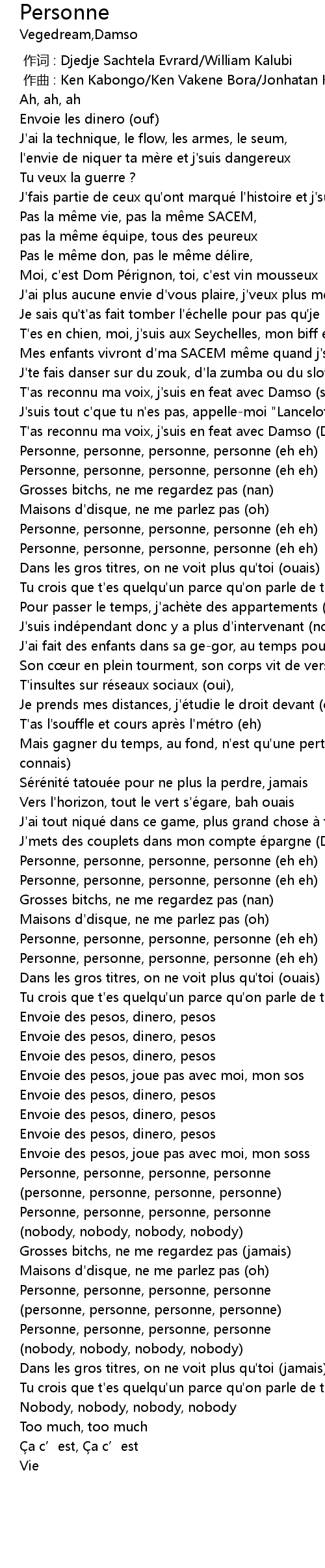 | [00:52.71] | Personne, personne, personne, personne (eh eh) |