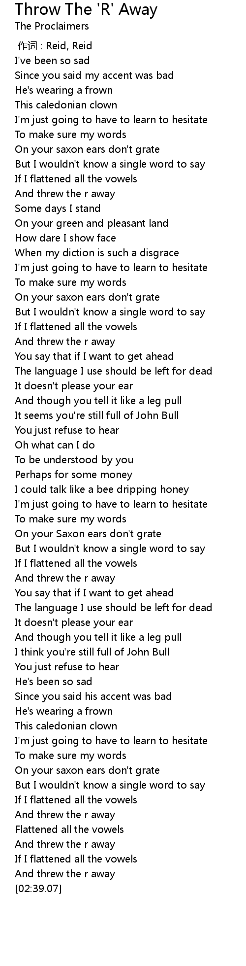 | [02:33.83] | And threw the r away |