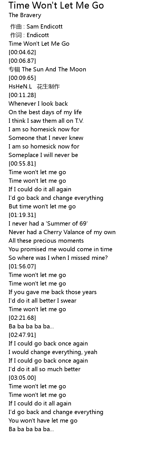 | [00:03.46] | Time Won't Let Me Go |